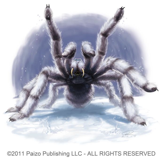 | 1. | Web (Ex) Creatures with the web ability can use webs to support themselves and up to one additional creature of the same size. In addition, such creatures can throw a web up to eight times per day. This is similar to an attack with a net but has a maximum range of 50 feet, with a range increment of 10 feet, and is effective against targets up to one size category larger than the web spinner. An entangled creature can escape with a successful Escape Artist check or burst the web with a Strength check. Both are standard actions with a DC equal to 10 + 1/2 the creature’s HD + the creature’s Con modifier. Attempts to burst a web by those caught in it take a –4 penalty. Web spinners can create sheets of sticky webbing up to three times their size. They usually position these sheets to snare flying creatures but can also try to trap prey on the ground. Approaching creatures must succeed on a DC 20 Perception check to notice a web; otherwise they stumble into it and become trapped as though by a successful web attack. Attempts to escape or burst the webbing gain a +5 bonus if the trapped creature has something to walk on or grab while pulling free. Each 5-foot-square section of web has a number of hit points equal to the Hit Dice of the creature that created it and DR 5/—. A creature can move across its own web at its climb speed and can pinpoint the location of any creature touching its web. Format: web (+8 ranged, DC 16, 5 hp); Location: Special Attacks. |