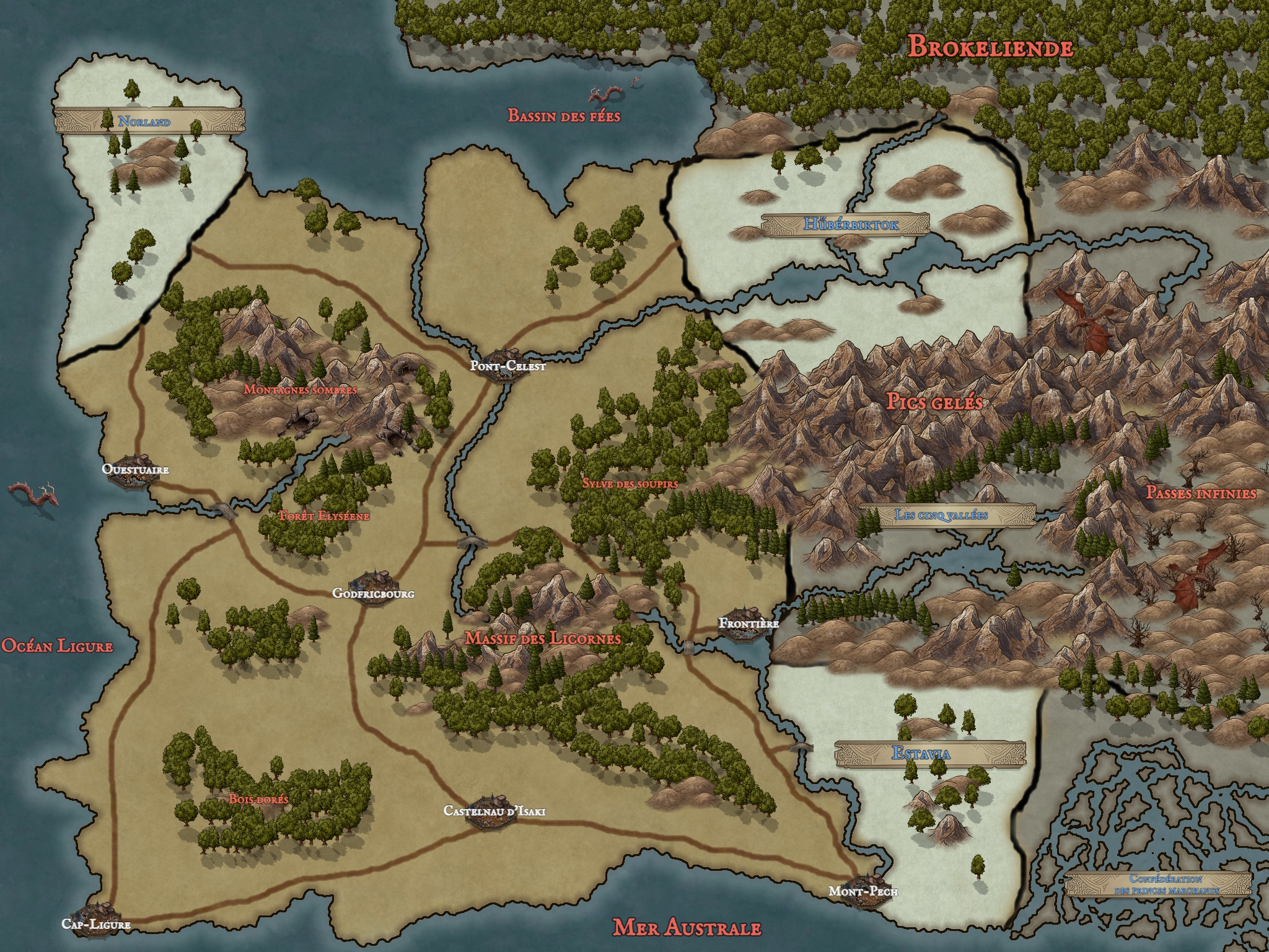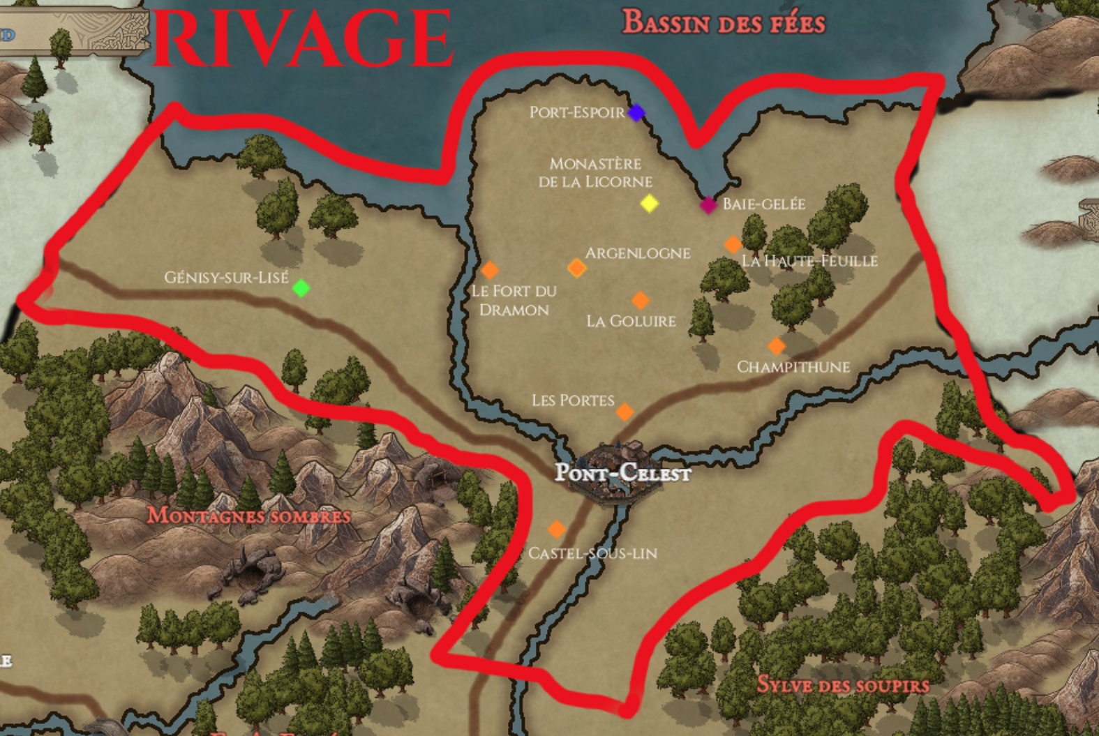 Le Fort du Dramon ♦ : Ancien Fort près de l'embouchure du Dramon (le fleuve qui va de Pont-Celest au Bassin des Fées). Il n'a plus de fort que le nom. Depuis la conquête du Nordland, il ne sert plus réellement pour la défense, mais pour le commerce (vers la capitale, ou en cabotage vers Nordland justement). On pense qu'il doit son nom aux bateaux Nordlandais, arborant des têtes de dragons. Dramon est certainement une déformation du mot dans le patois local.