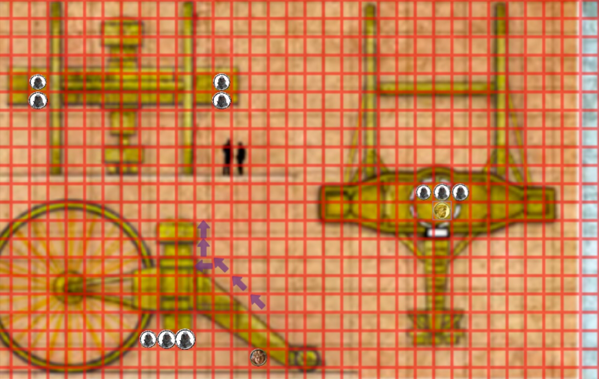 Les soldats sont dans le char d'assaut, le seule façon d'y entrer c'est par un sas blindé ou par le trou que Shimrod a fait avec sa désintégration. Avec ton mouvement tu arrives à entrer, et tu peux faire une attaque. Mais tu provoquera 3 AO pour les 3 soldats en haut.