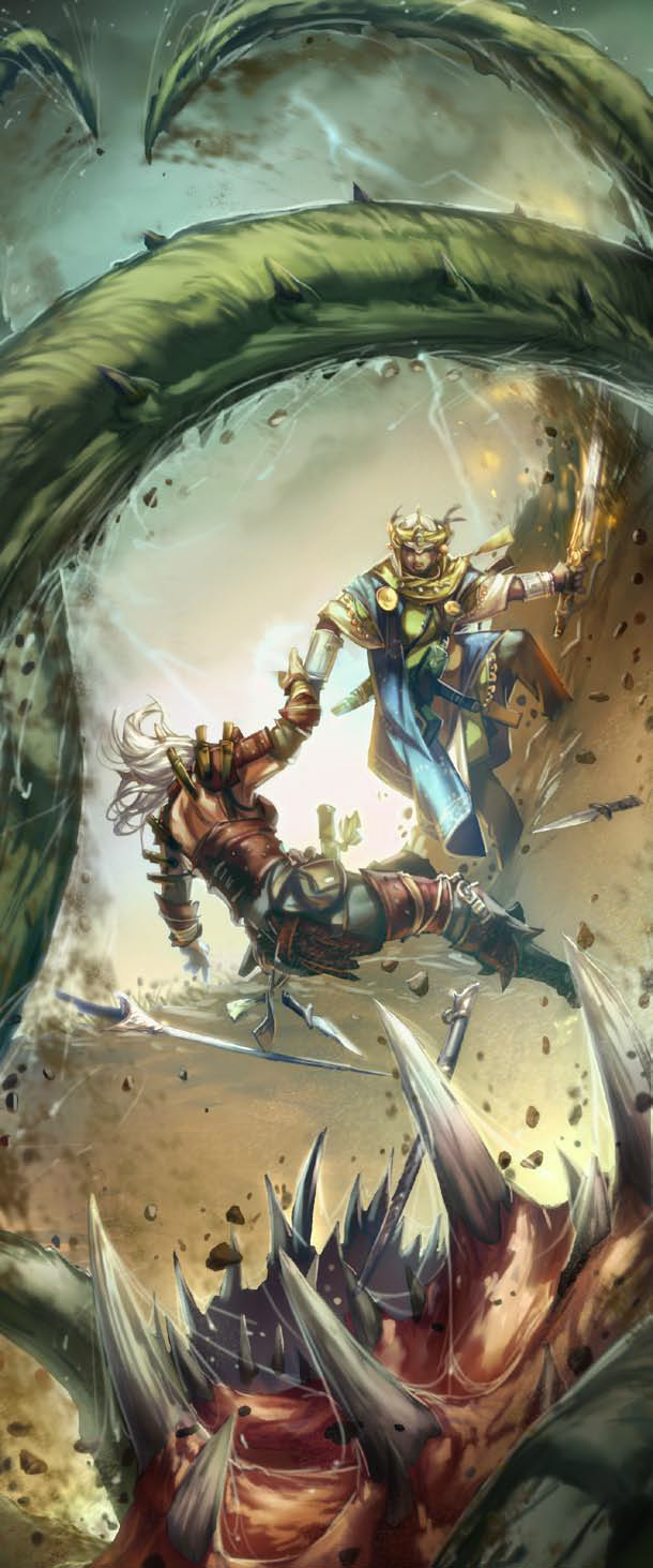 Après s'être déplacé vers le nord, Amud'habi perçoit sous ses pieds une vibration. Alors qu'il se retourne pour voir si ses compagnons sentirent aussi la secousse, une gerbe de sable explose entre lui et le guerrier, créant ainsi un trou duquel une bouche et des tentacules s'échappent.
