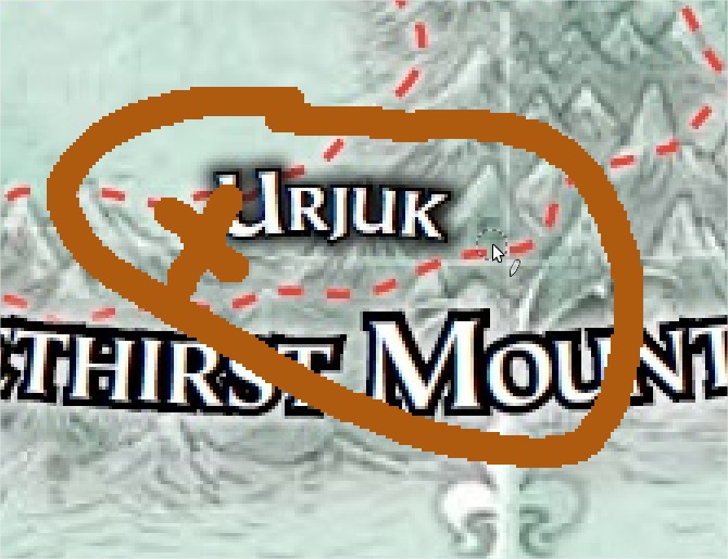 L'itinéraire le plus connu est celui-ci... lance l'ulfen en griffonnant sur la carte. C'est le plus facile mais également le plus connu. Si vos amis vous surveille, ce n'est peut-être pas le meilleur à suivre. Mais pour se rendre à ce point si! 39147-0 Indiquant la ville d'Urjuk, Il nous faudra traverser une partie des terres du Linnorn, l'Irrisen et un partie des terres des seigneurs des mammouths. Si tout và bien, il faudra environ 1 mois pour se rendre jusqu'à Urjuk. Ensuite, nous emprunterons cet itinéraire ou celui-ci 39149-1