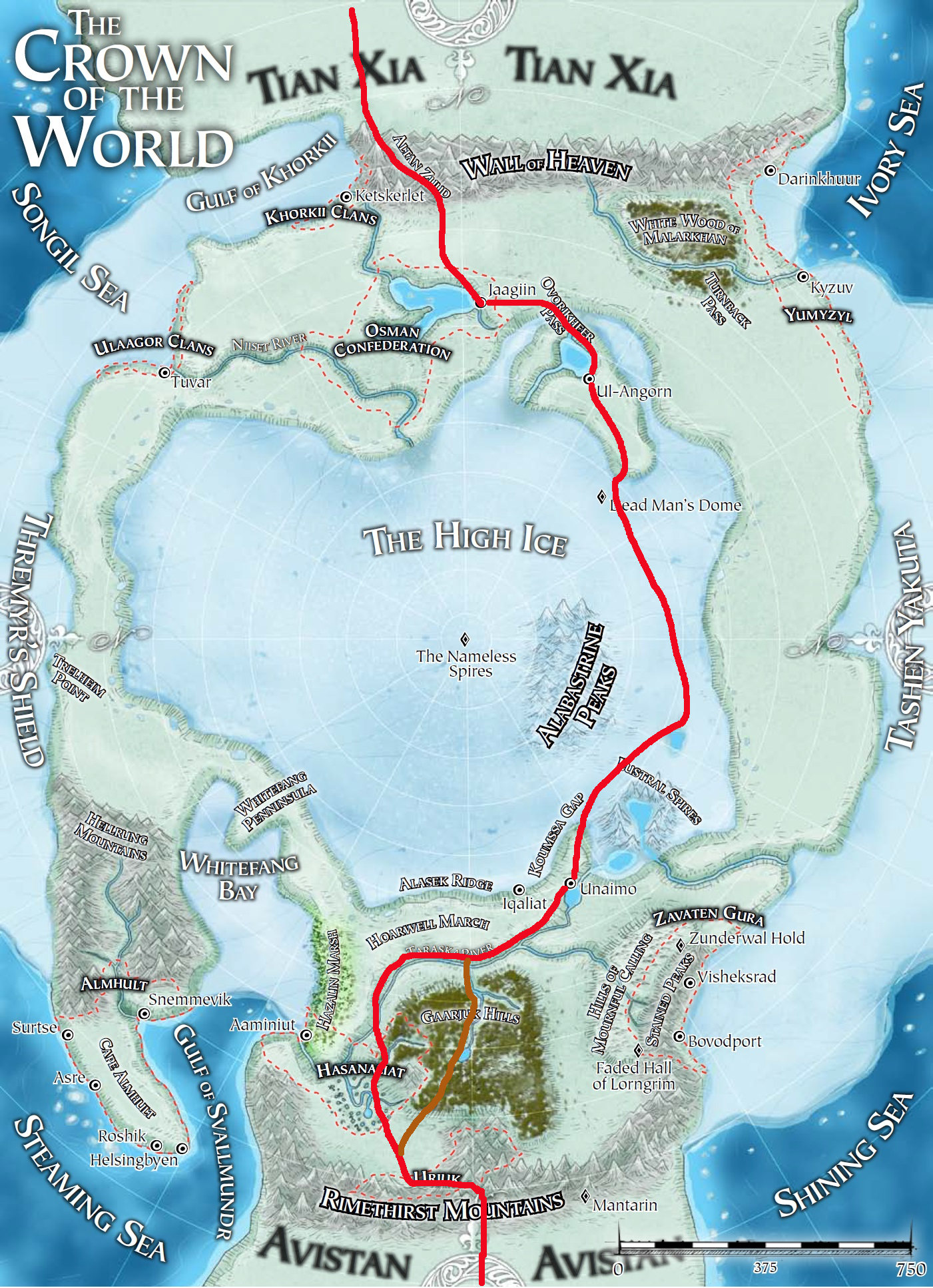 Comme je disais, avant d'arriver à Urjuk, nous devrons trouver un itinéraire pour s'approvisionner et commercer. Une fois rendu à la couronne du monde, il n'y a plus aucune ville. Nous devrons donc avoir tout en notre possession ou être en mesure de fabriquer ce dont nous aurons besoins.