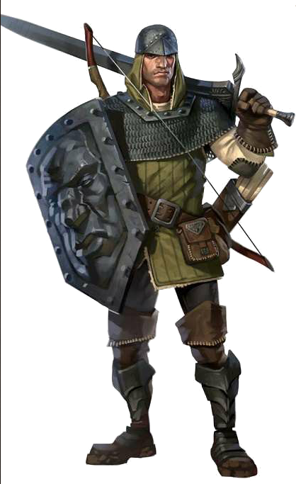 Il cherche clairement à vous retenir tout en donnant l'alarme à ses compagnons, mais n'y parvient guère plus d'une minute devant les coups de Toris et les flèches de Feutard qui accompagnent chaque coup de hache. Il assène un magistral coup d'estoc qui fait vaciller Toris, mais reçoit en retour un flèche de Feutard qui se fiche profondément dans son épaule. Hésitant, et manifestement exaspéré par le manque de réaction à ses cris, il lâche un retentissant "Lyrie putain de m..." interrompu par le shuriken de Finn qui se plante dans sa gorge; il s'effondre sur le seuil d'un long escalier de pierre qui descend dans les profondeurs de Pic Chardon...