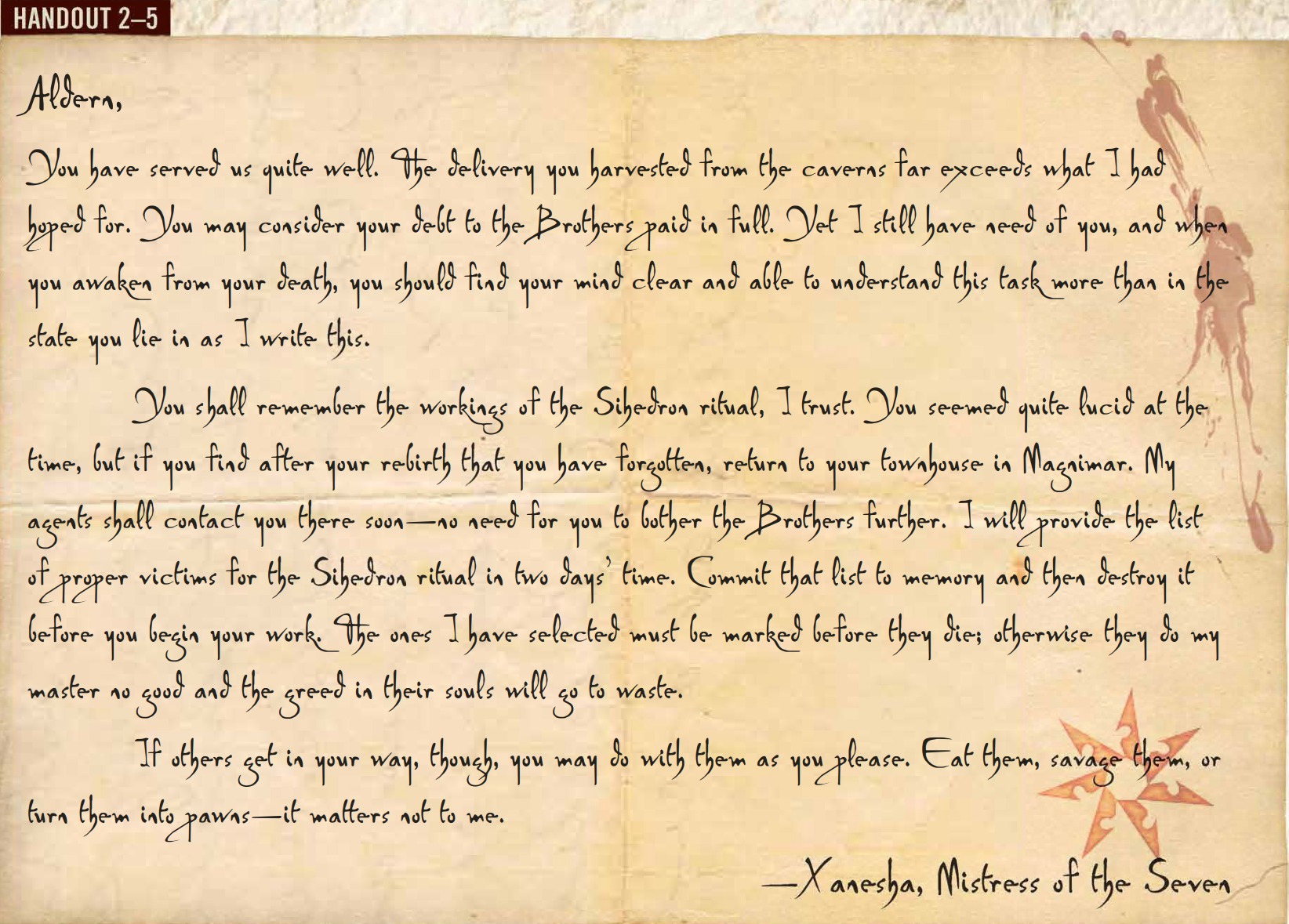 C'est alors que Xanesha a décidé d'impliquer Aldern dans ses plans. Promis que sa dette envers les Frères des Sept serait bientôt entièrement payée, on lui a dit qu'il pourrait enfin rencontrer le mystérieux mécène du groupe. Il a été emmené devant Xanesha, qui sous sa forme humaine a informé Aldern qu'une tâche finale lui restait. C'était une tâche simple, vraiment retourner à Foxglove Manor, attraper l'un des rats malades qui sévissaient dans les caves et revenir avec lui à Xanesha pour qu'elle l'étudie.