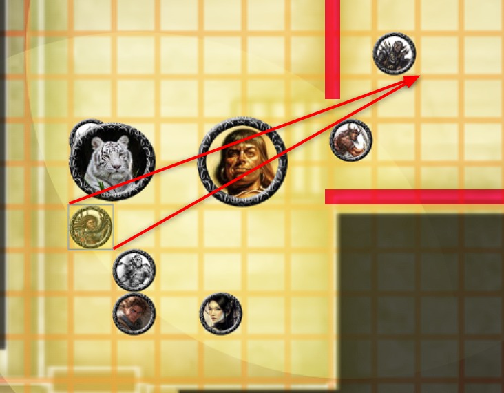 Pas si l'allié est large! Il n'y a pas de vision sur la cible! Ghump bloque la ligne de visée. Tu dois voir un coin de la case de la créature pour pouvoir le tirer.